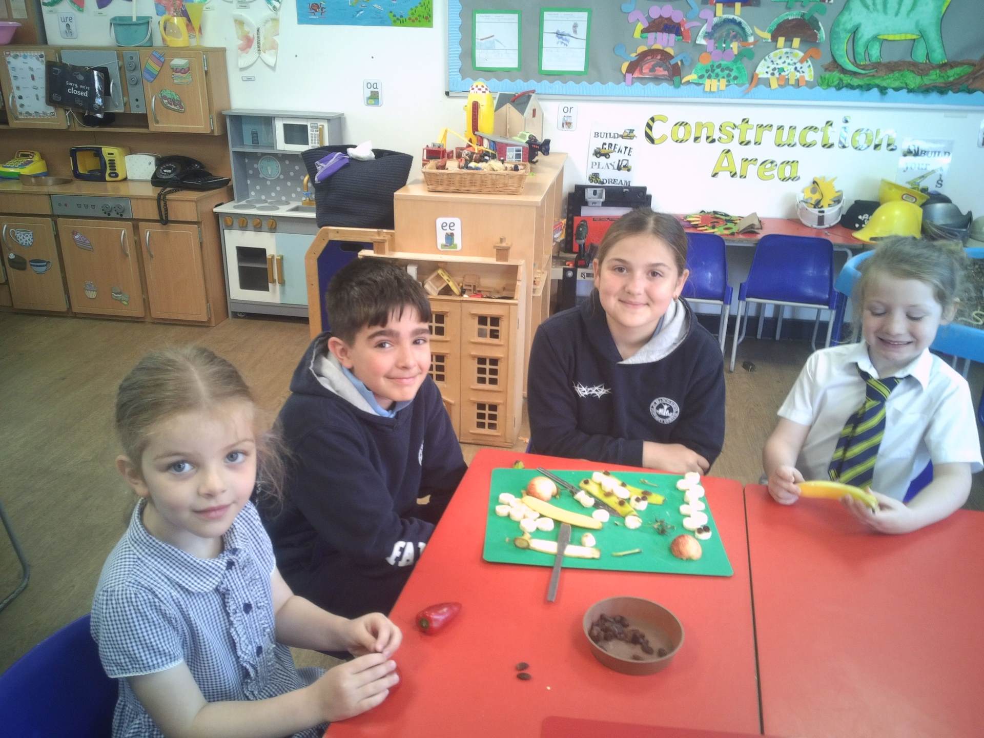 Another highlight was a creative collaboration with our Year 6 buddies, where we made minibeasts out of fruit! It was a fantastic opportunity for teamwork, creativity, and a healthy snack all in one.