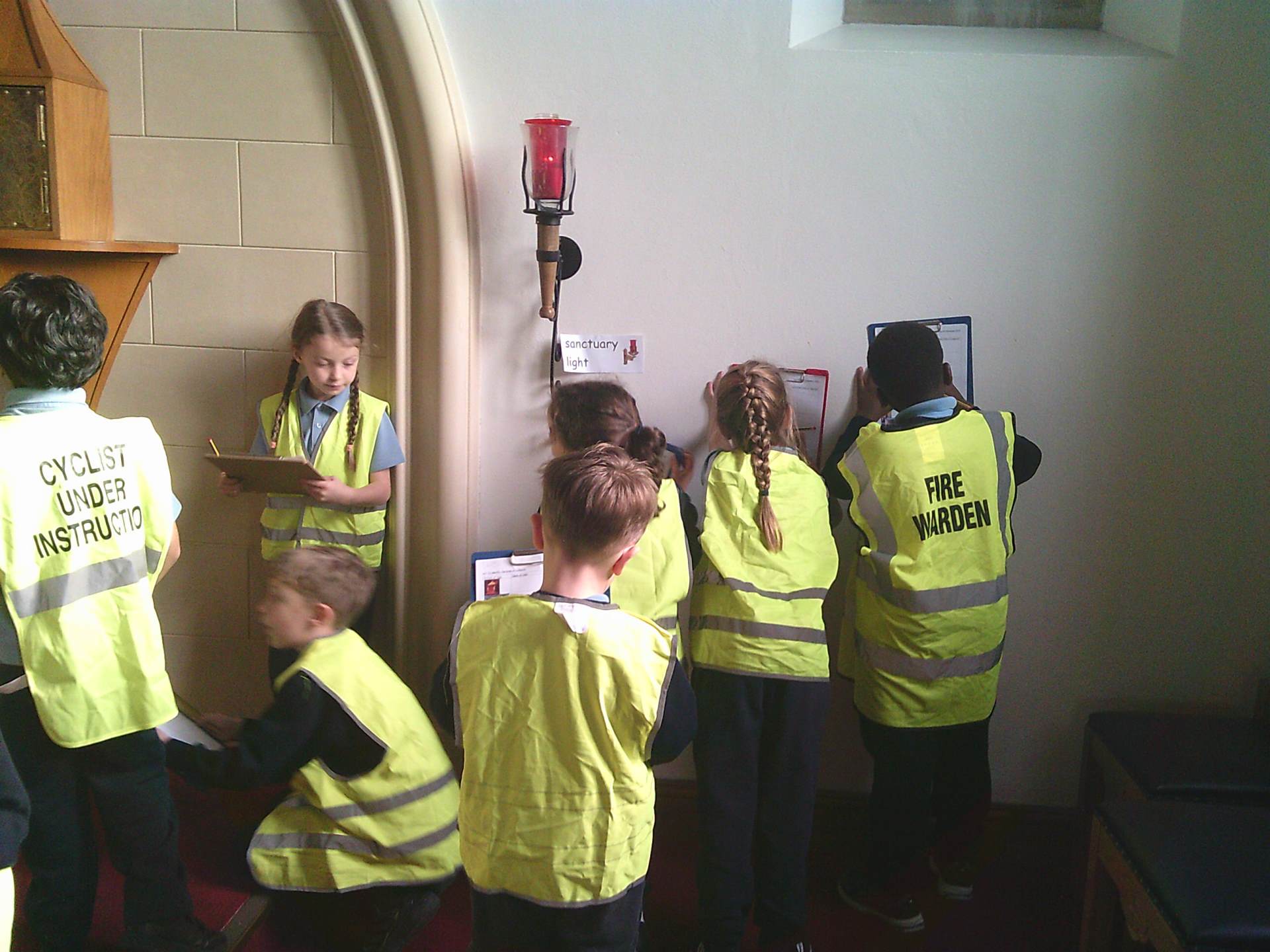 objects we had found out about during our lessons. Seeing the items in real life really helped them to put meaning to their learning. We looked closely at the stained glass windows in the church, noticing the colours used, how they are different from normal windows and the images they depicted. We were really grateful to the parents who helped us on our walk to and from the church!