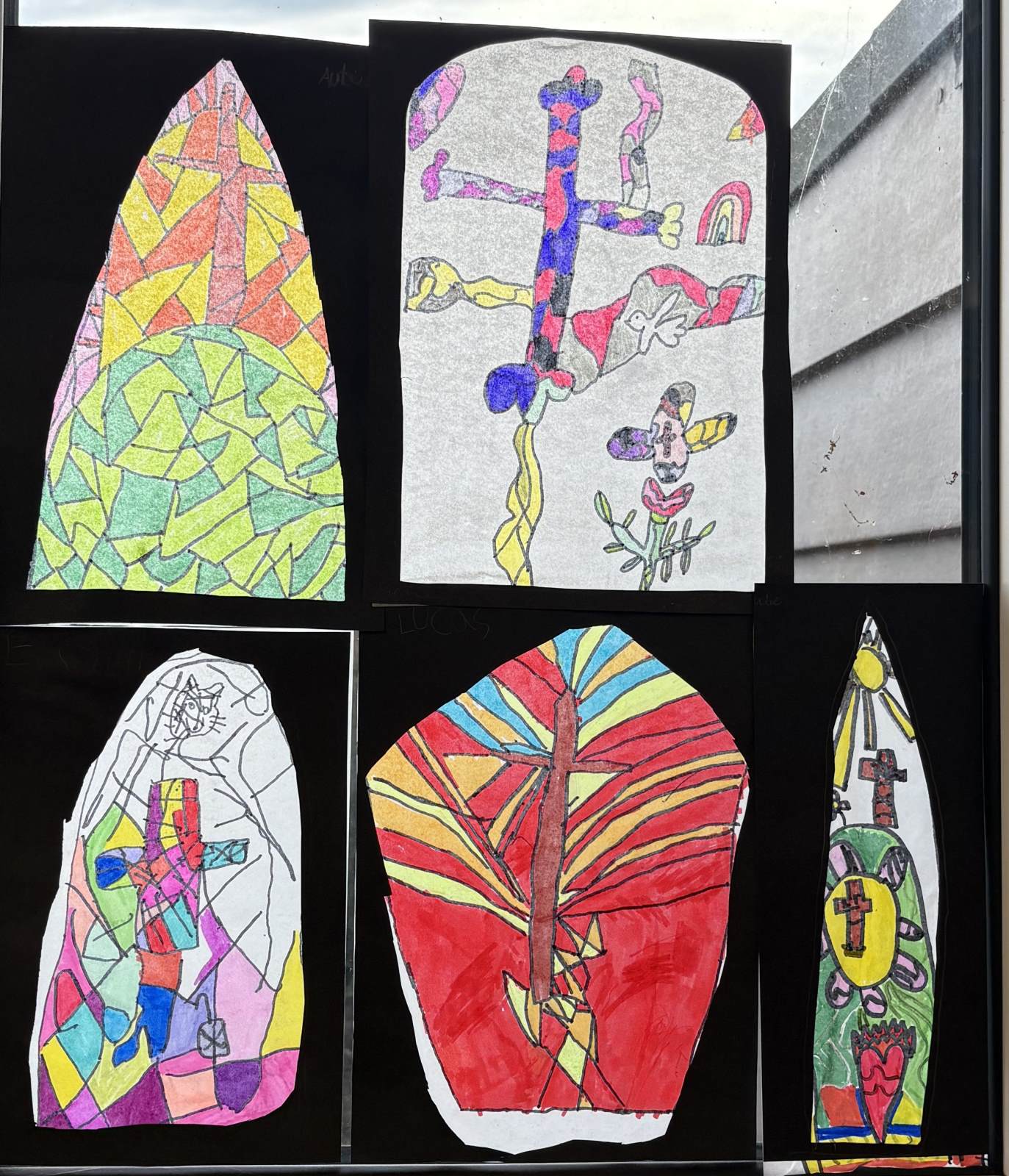 Finally, we used our observations of the stained glass windows to design and create our own. We were so impressed with the creativity shown by the children during this activity. They had full choice over the shape and images shown in their windows and the finished artwork is beautiful. The stained glass windows are now being proudly displayed in our classroom.
