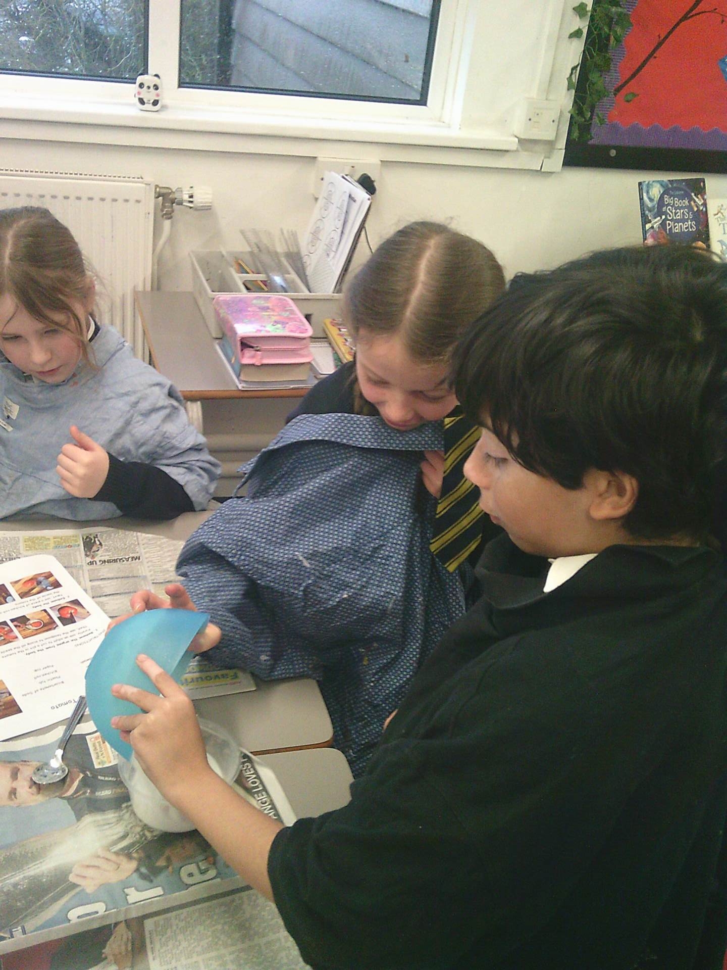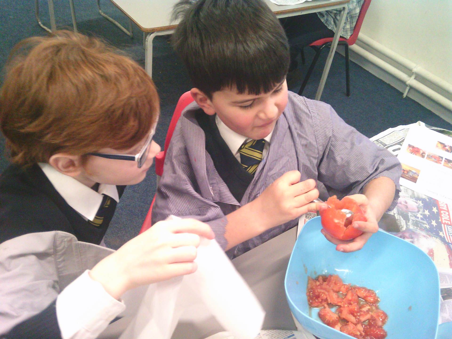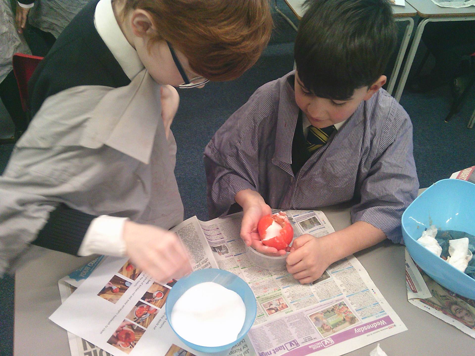 We each had a tomato and we worked together. We covered the tomato in salt and bicarbonate soda. It was really fun and really messy!