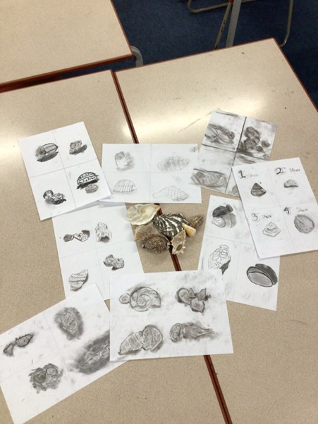 Year 6 students created still life drawings of shells using charcoal. They focused on carefully observing shape, texture, and proportion while experimenting with light and shade. Students practised blending, smudging, and layering charcoal to show form and depth, and used highlights and shadows to bring their drawings to life. The activity helped develop confidence with charcoal and strengthened observational drawing skills.