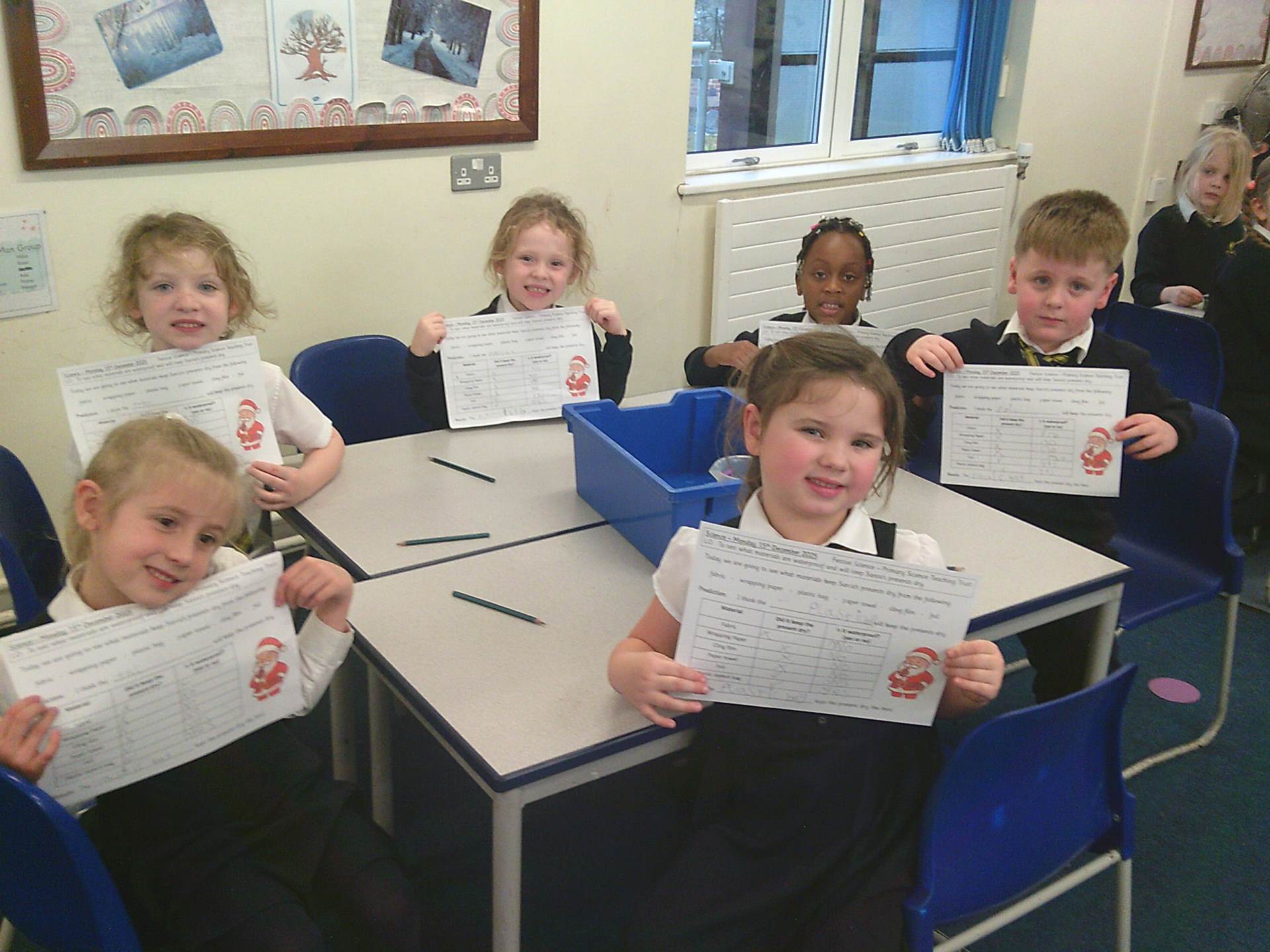 One challenge focused on discovering which materials would keep Santa’s presents dry. Children tested a variety of materials, observing which absorbed water and which were waterproof. In the Star Challenge, children created stars using different materials and placed them onto water to see which star opened first, learning how materials react differently when wet.