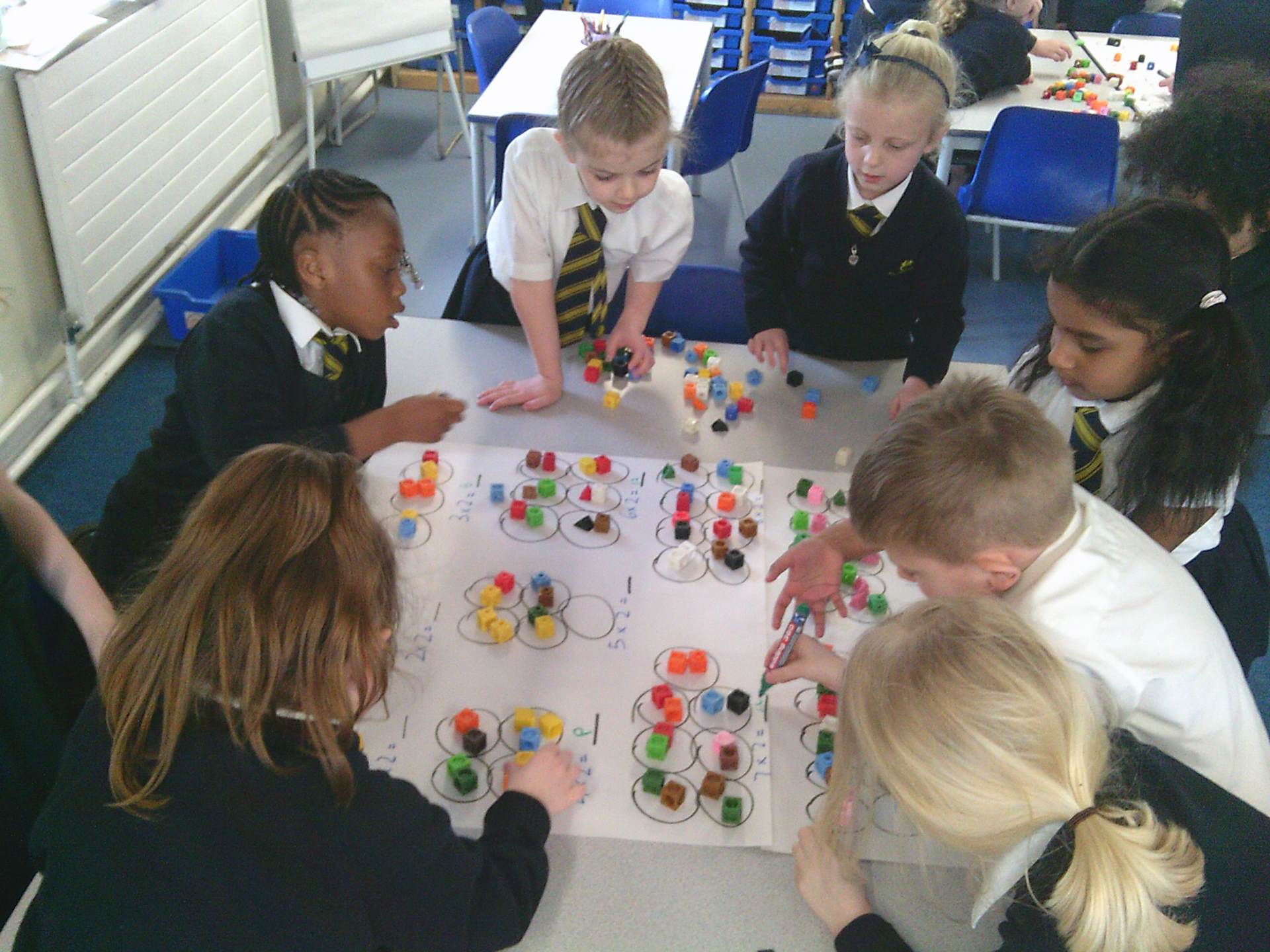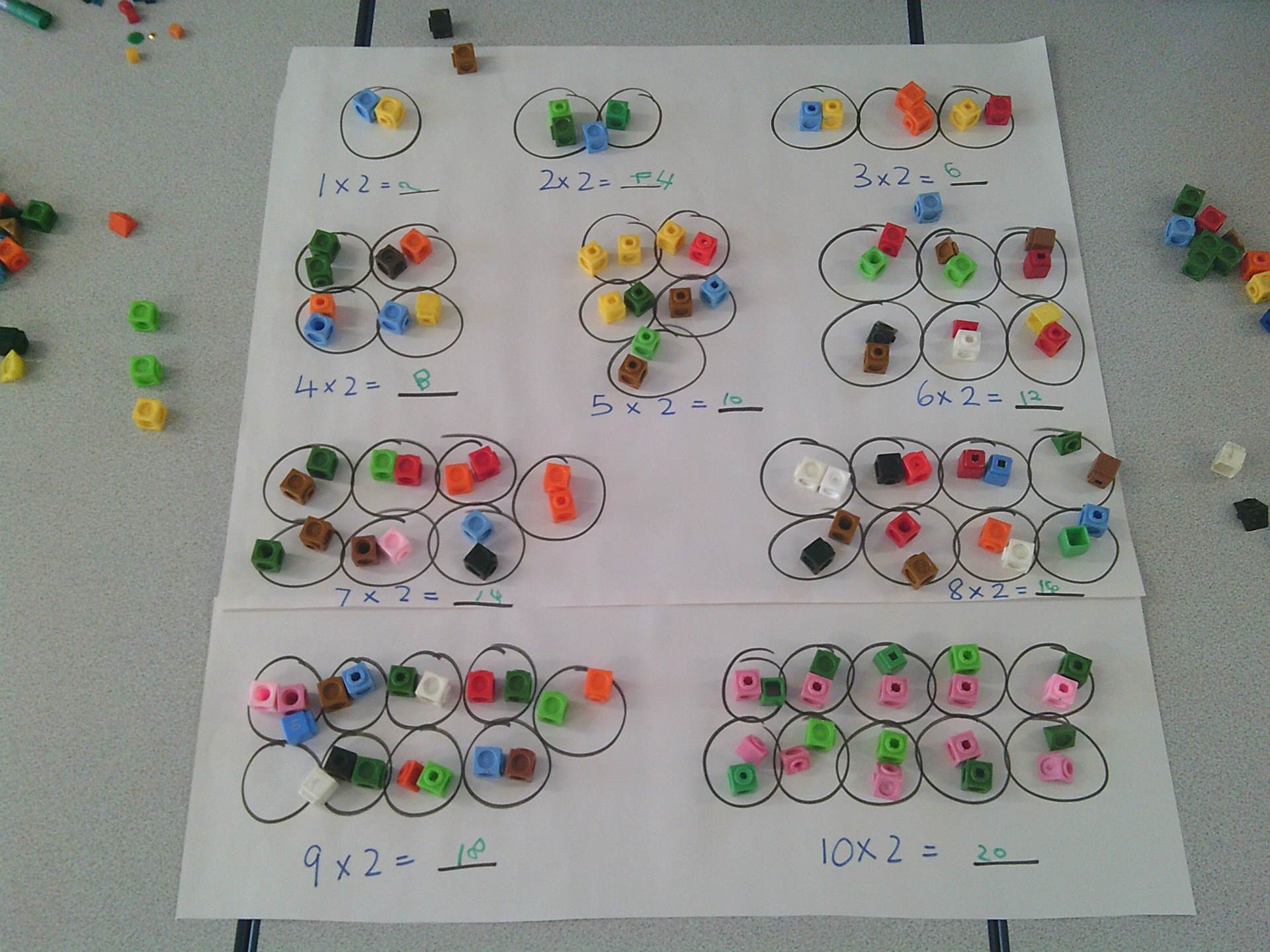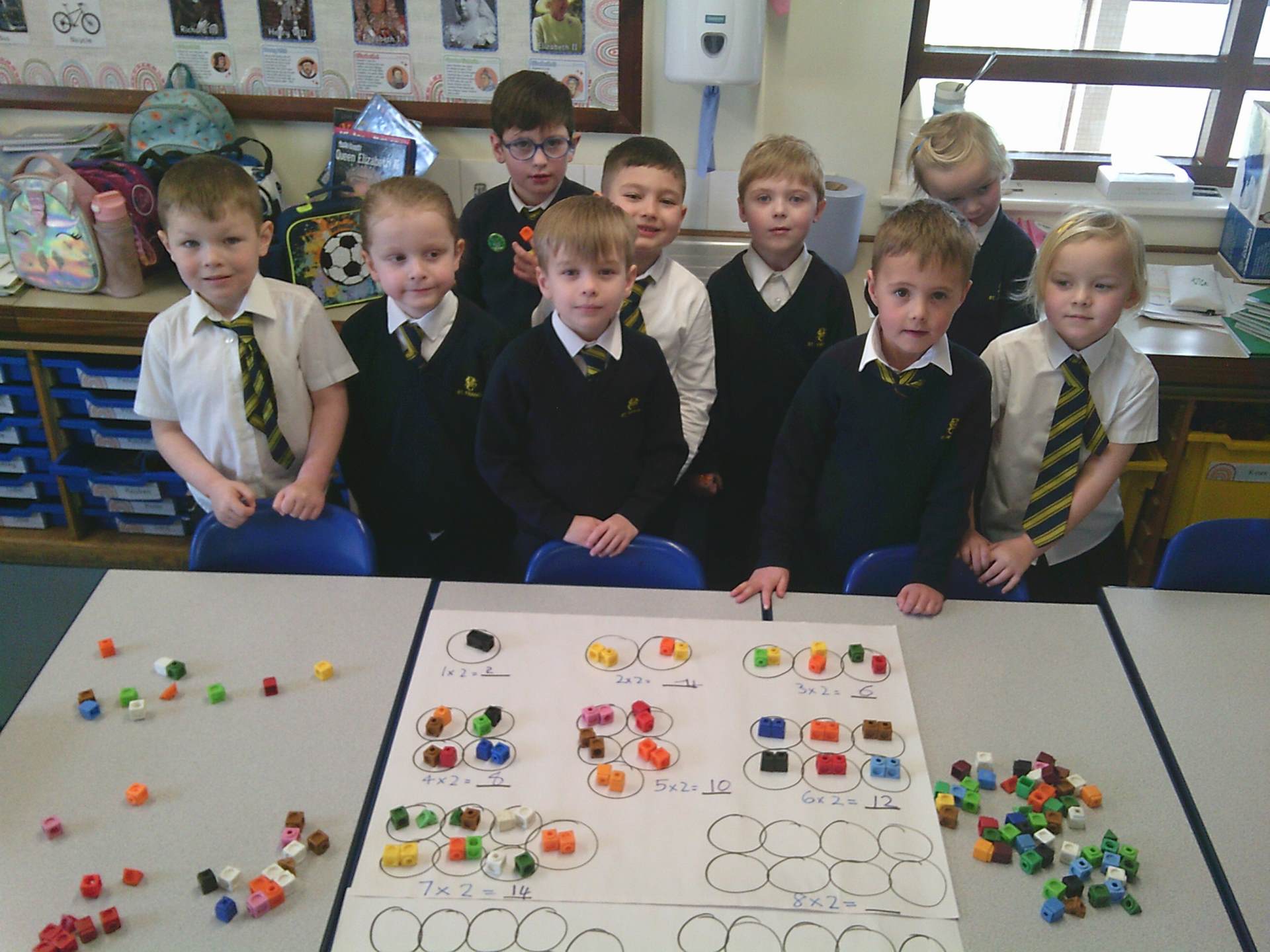 our two times tables. We have used different methods including choral chanting of 1x2 = 2, 2x2 =4 etc… and creating doubling bridging fingers as a mirror image with our partners to help the children visually see how multiplying by 2 is just having 2 of the same number. The children enjoyed a small group practical activity of grouping cubes into twos again to visually represent the multiplication with some children challenging themselves to go past 10x2 to make both 11x2 and 12x2 independently.