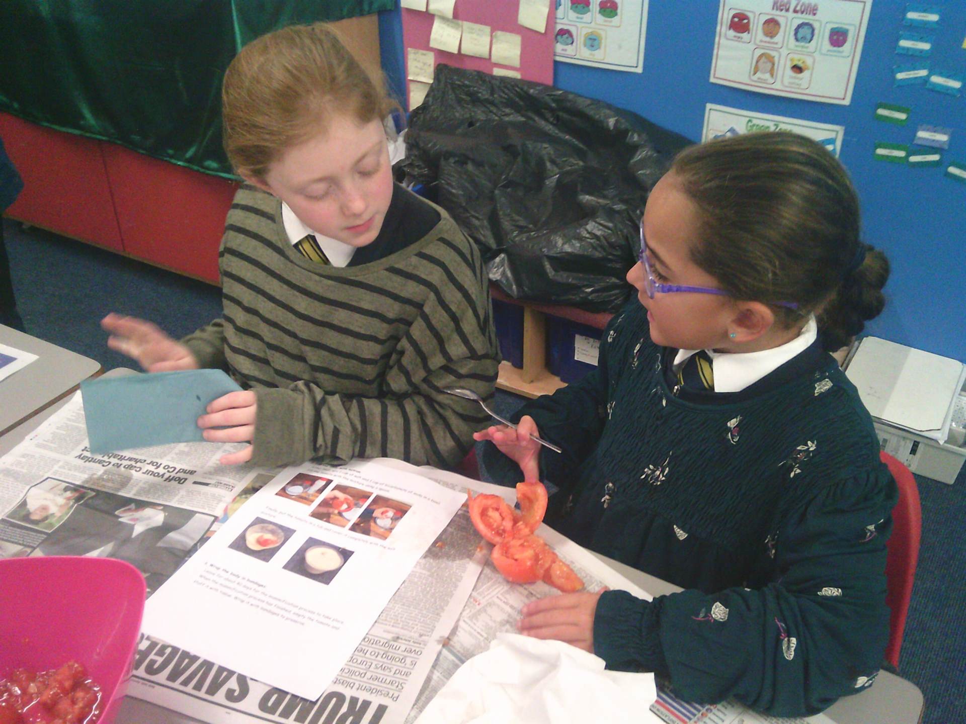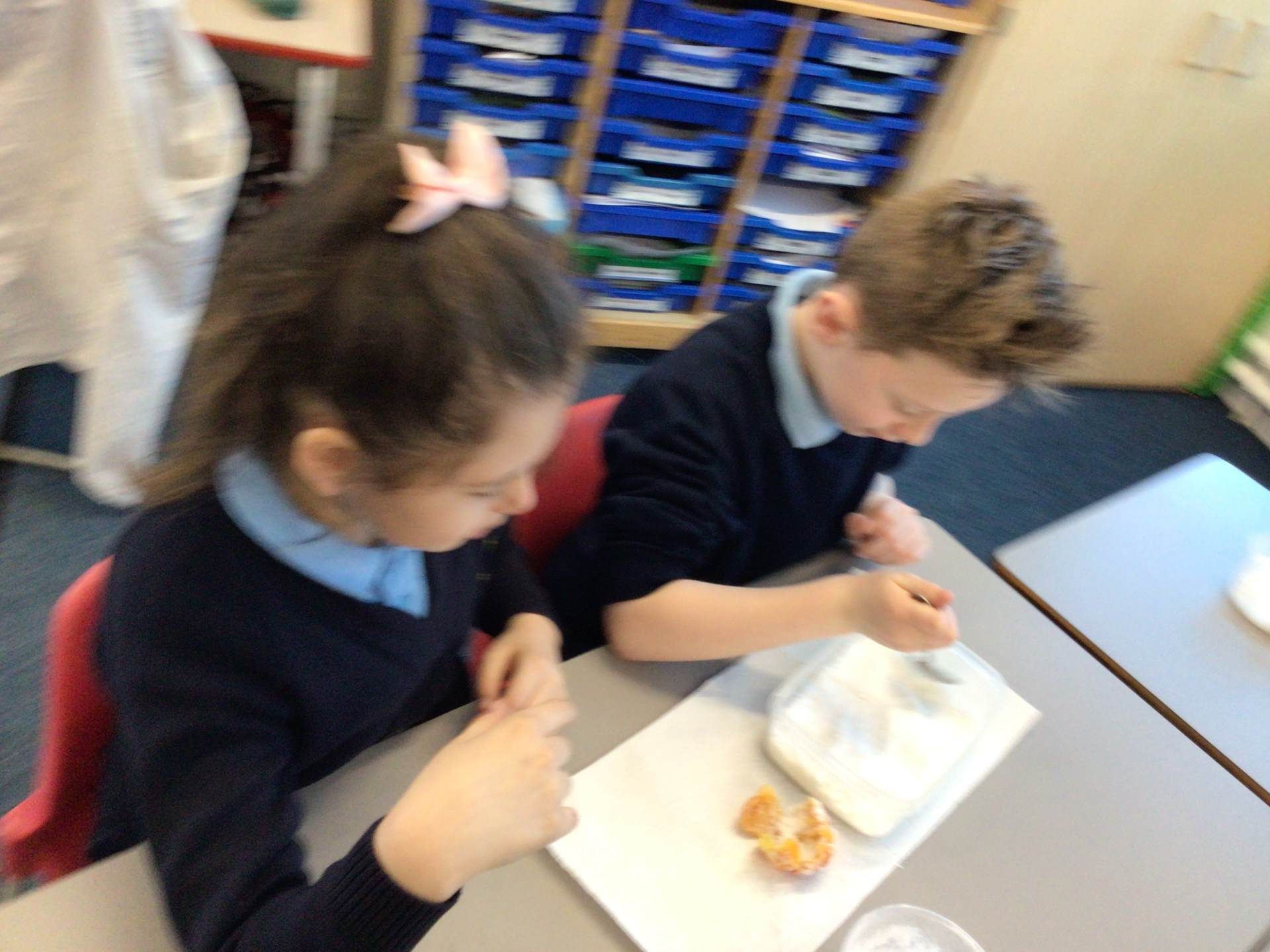 We each had a tomato and we worked together. We covered the tomato in salt and bicarbonate soda. It was really fun and really messy!