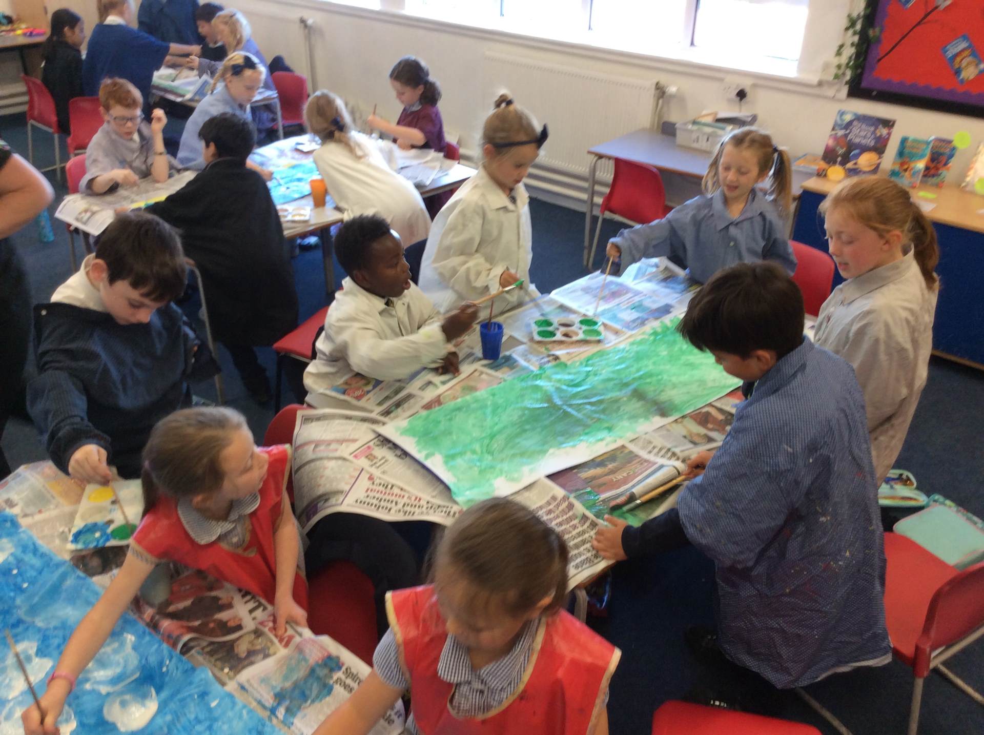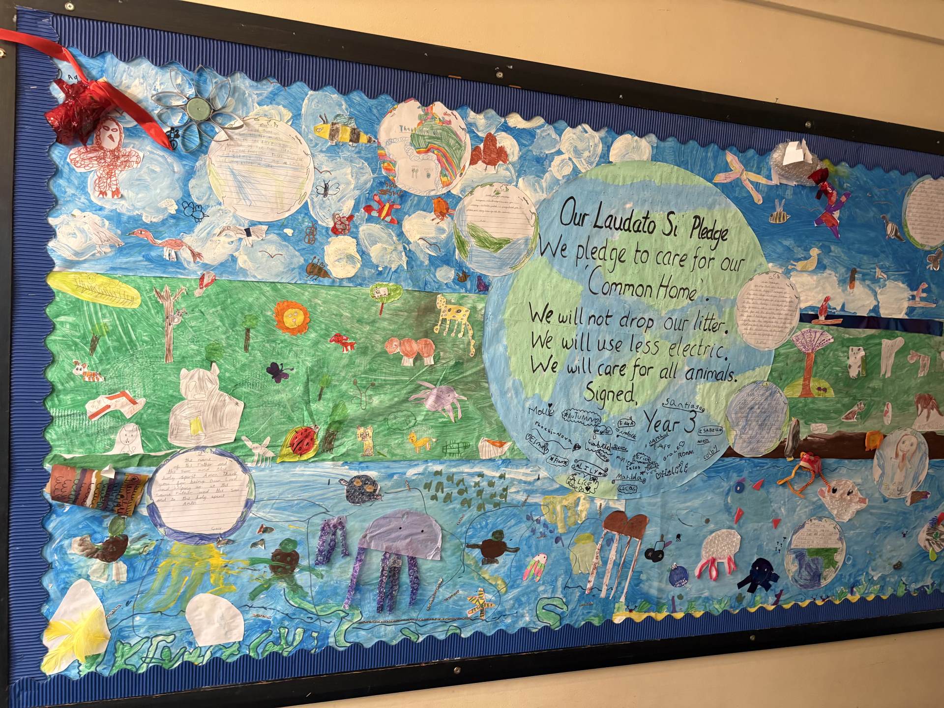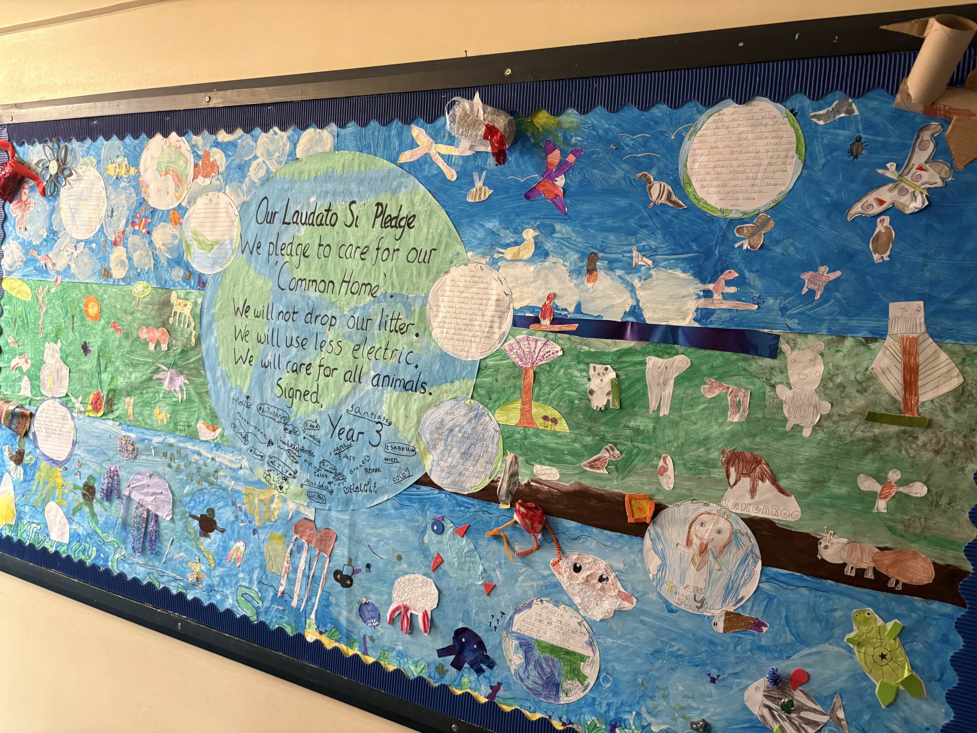 As part of our celebrations for the Feast of St. Francis of Assisi, our school community came together to create a vibrant and meaningful collaborative mural, inspired by the messages of Laudato Si’. Using a wide range of art resources and techniques, all pupils from year 3 contributed to the design and creation of this beautiful piece, which now proudly adorns one of our school walls.