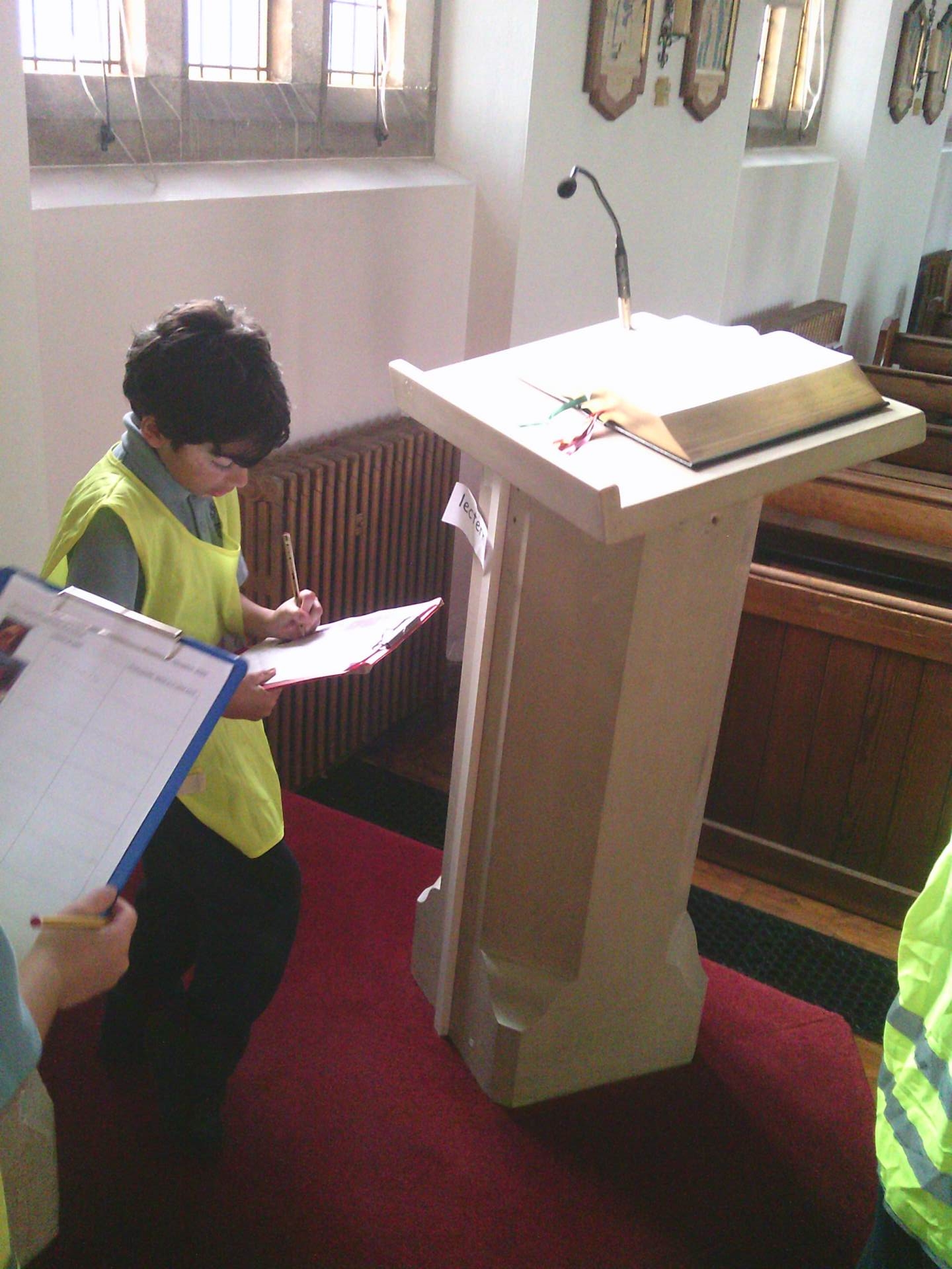 objects we had found out about during our lessons. Seeing the items in real life really helped them to put meaning to their learning. We looked closely at the stained glass windows in the church, noticing the colours used, how they are different from normal windows and the images they depicted. We were really grateful to the parents who helped us on our walk to and from the church!