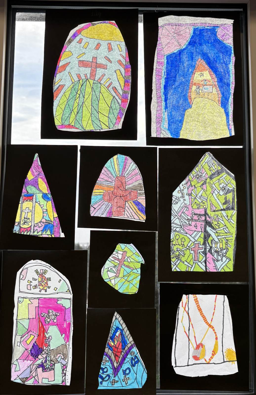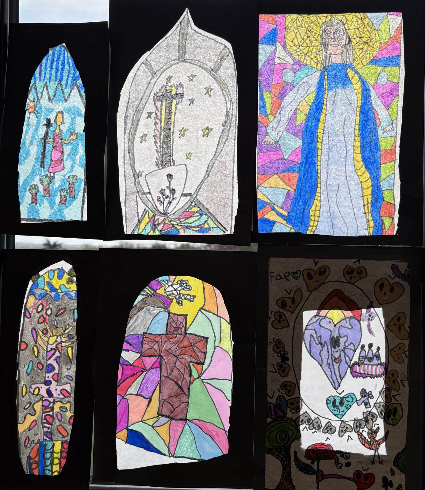 Finally, we used our observations of the stained glass windows to design and create our own. We were so impressed with the creativity shown by the children during this activity. They had full choice over the shape and images shown in their windows and the finished artwork is beautiful. The stained glass windows are now being proudly displayed in our classroom.