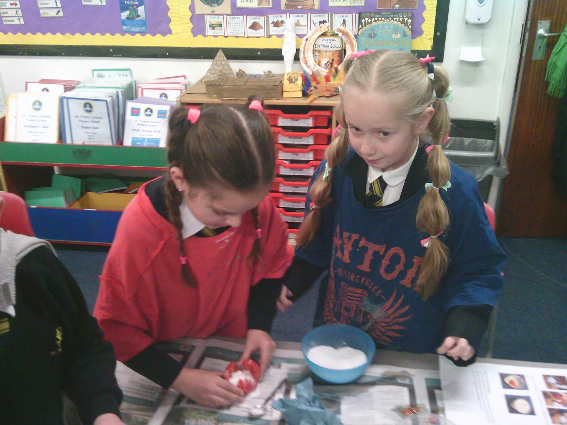 Year 3 took part in an exciting and memorable cross-curricular lesson where they mummified tomatoes as part of their science and history learning. The activity helped the children explore the Ancient Egyptian belief in preservation and the afterlife, while also giving them the opportunity to observe and discuss changes over time. Pupils carefully prepared their tomatoes and used salt to replicate the mummification process. We can't reveal the results yet as we have to leave the tomatoes for 40 days to allow the mummification process to take place.