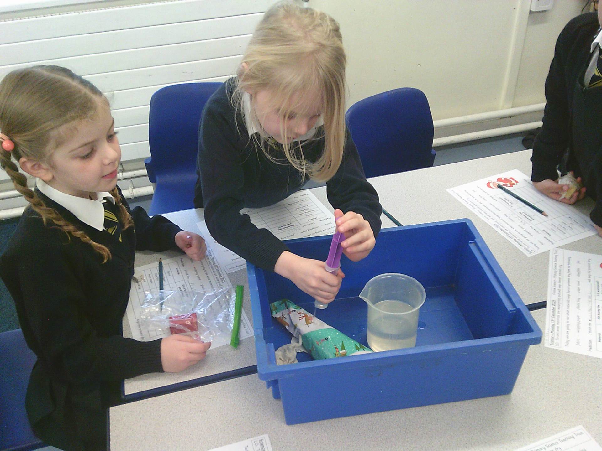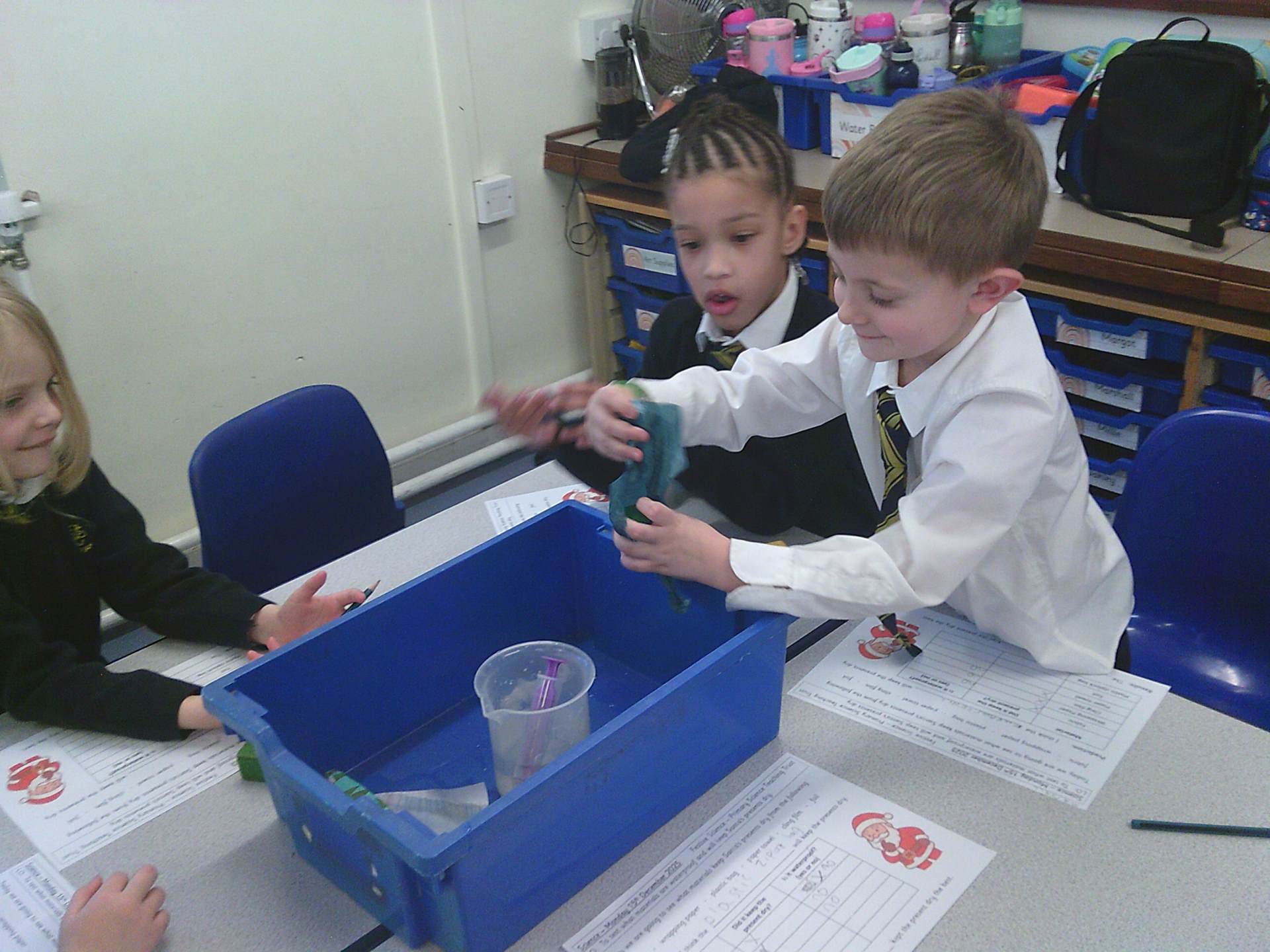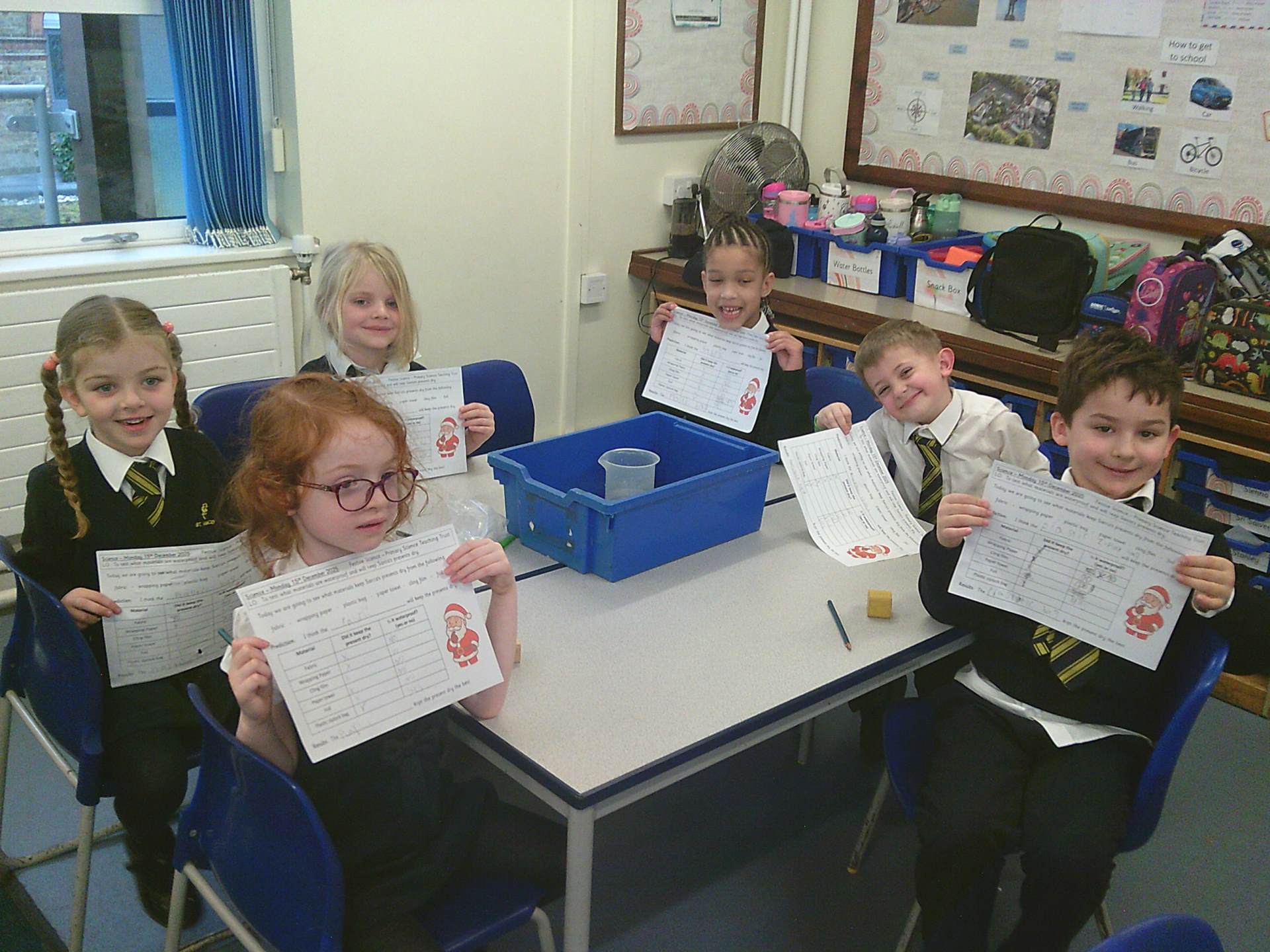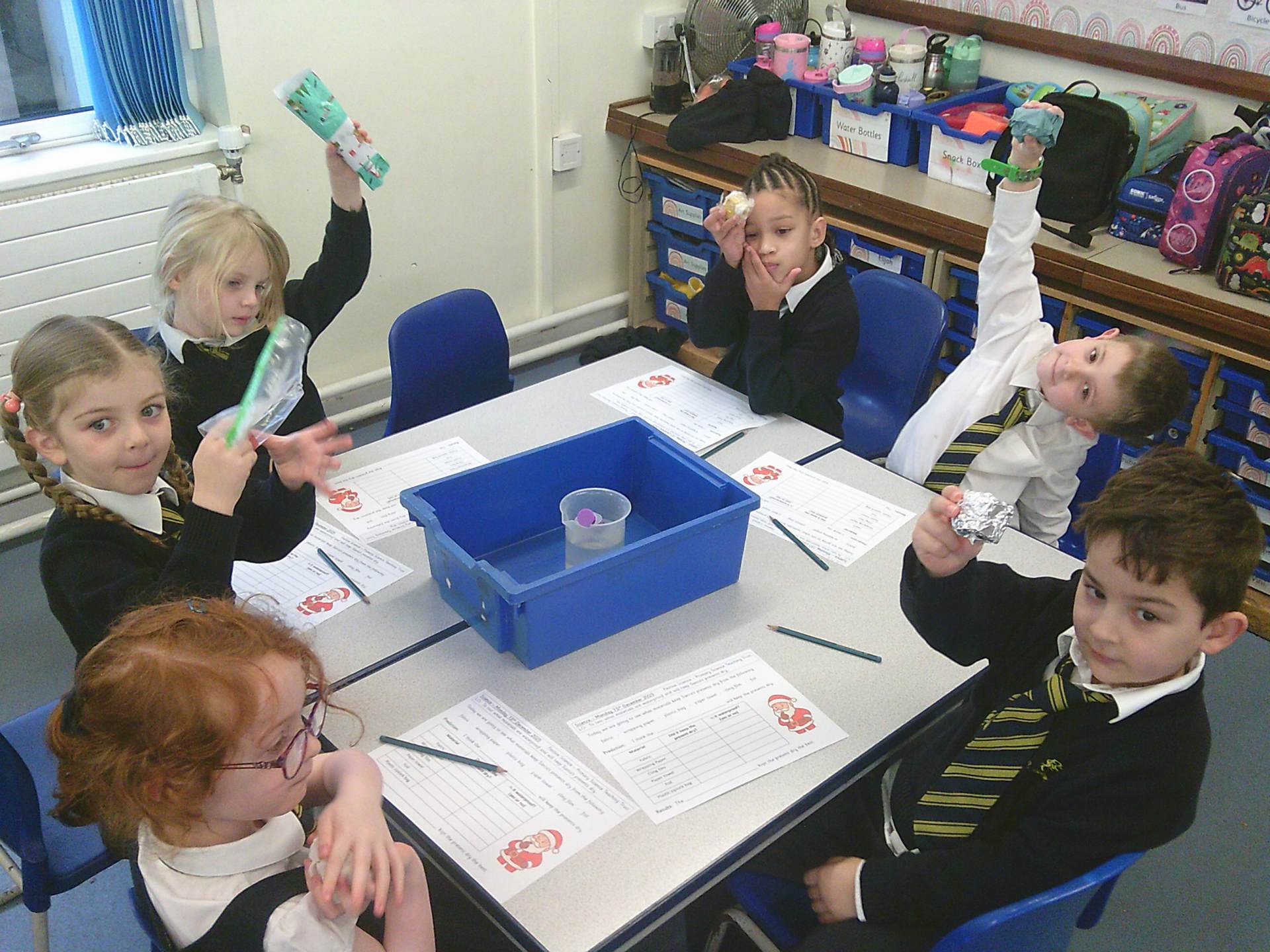 One challenge focused on discovering which materials would keep Santa’s presents dry. Children tested a variety of materials, observing which absorbed water and which were waterproof. In the Star Challenge, children created stars using different materials and placed them onto water to see which star opened first, learning how materials react differently when wet.