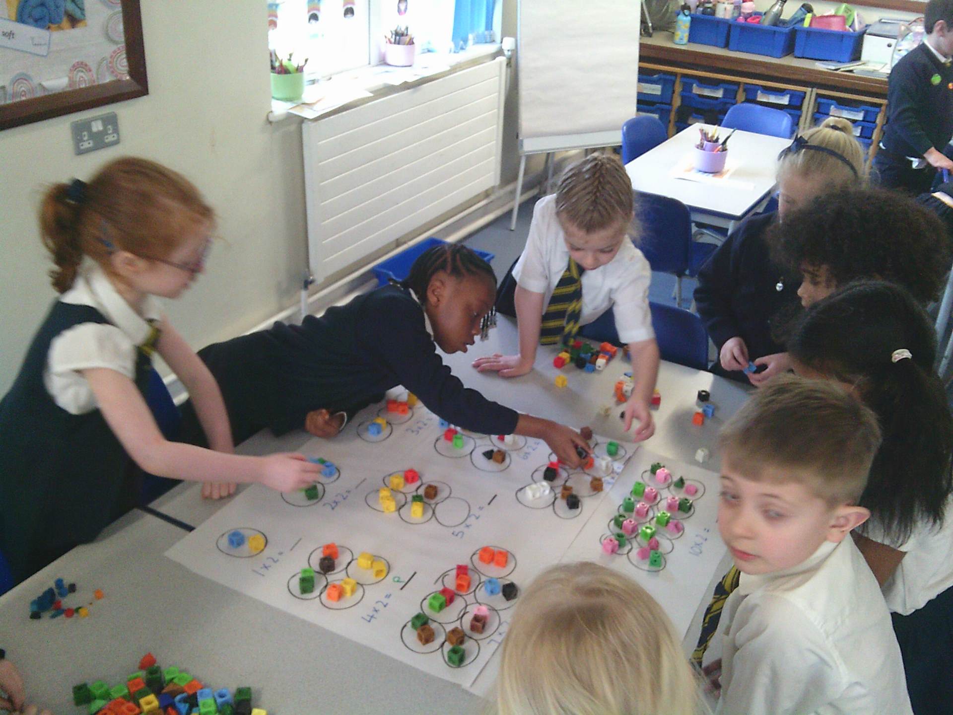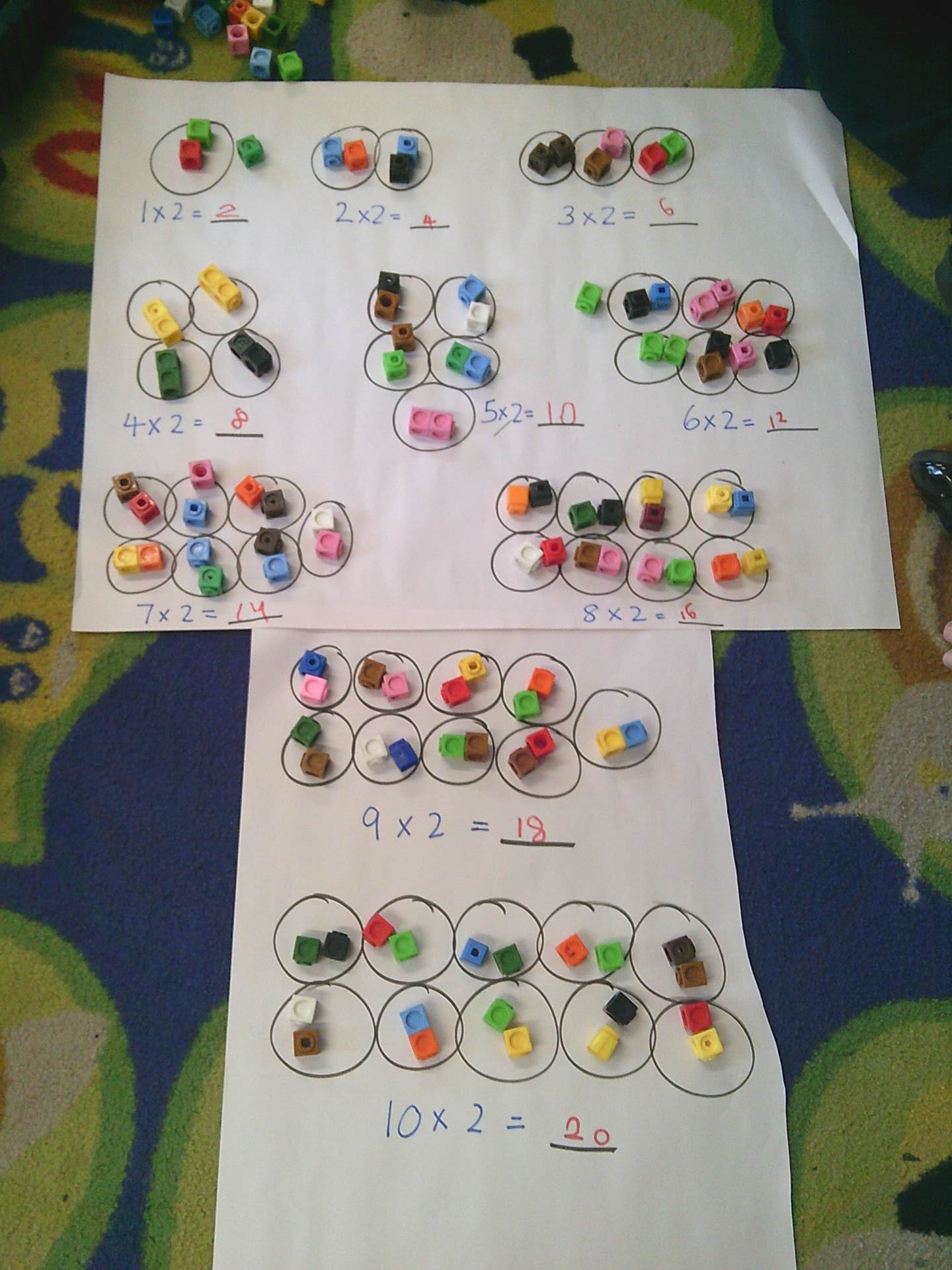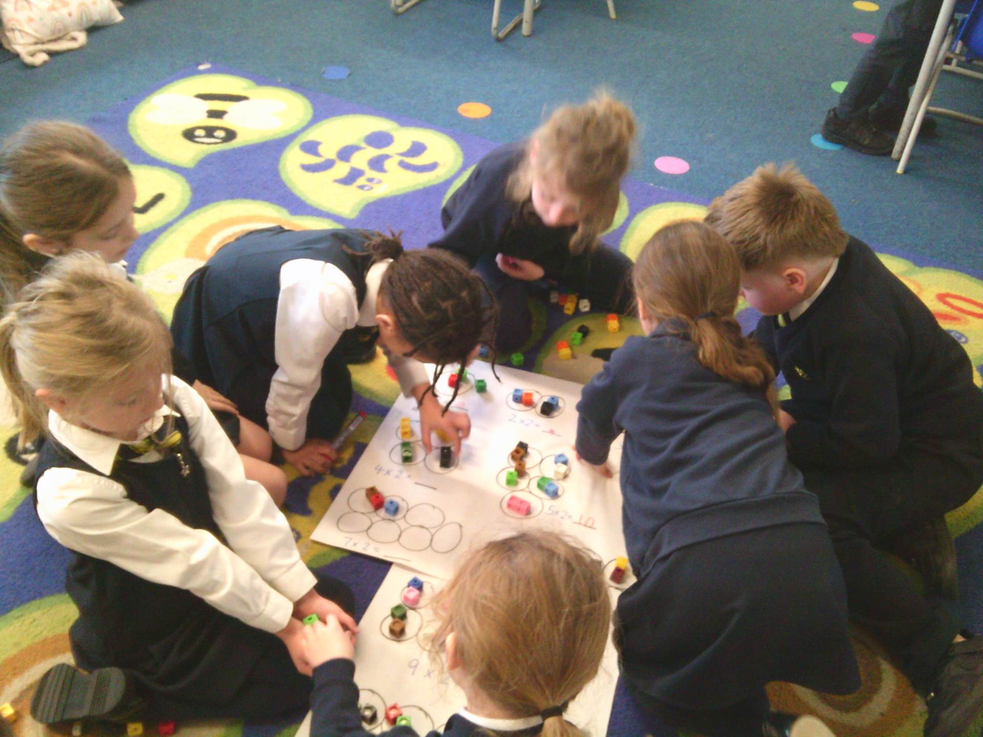 our two times tables. We have used different methods including choral chanting of 1x2 = 2, 2x2 =4 etc… and creating doubling bridging fingers as a mirror image with our partners to help the children visually see how multiplying by 2 is just having 2 of the same number. The children enjoyed a small group practical activity of grouping cubes into twos again to visually represent the multiplication with some children challenging themselves to go past 10x2 to make both 11x2 and 12x2 independently.