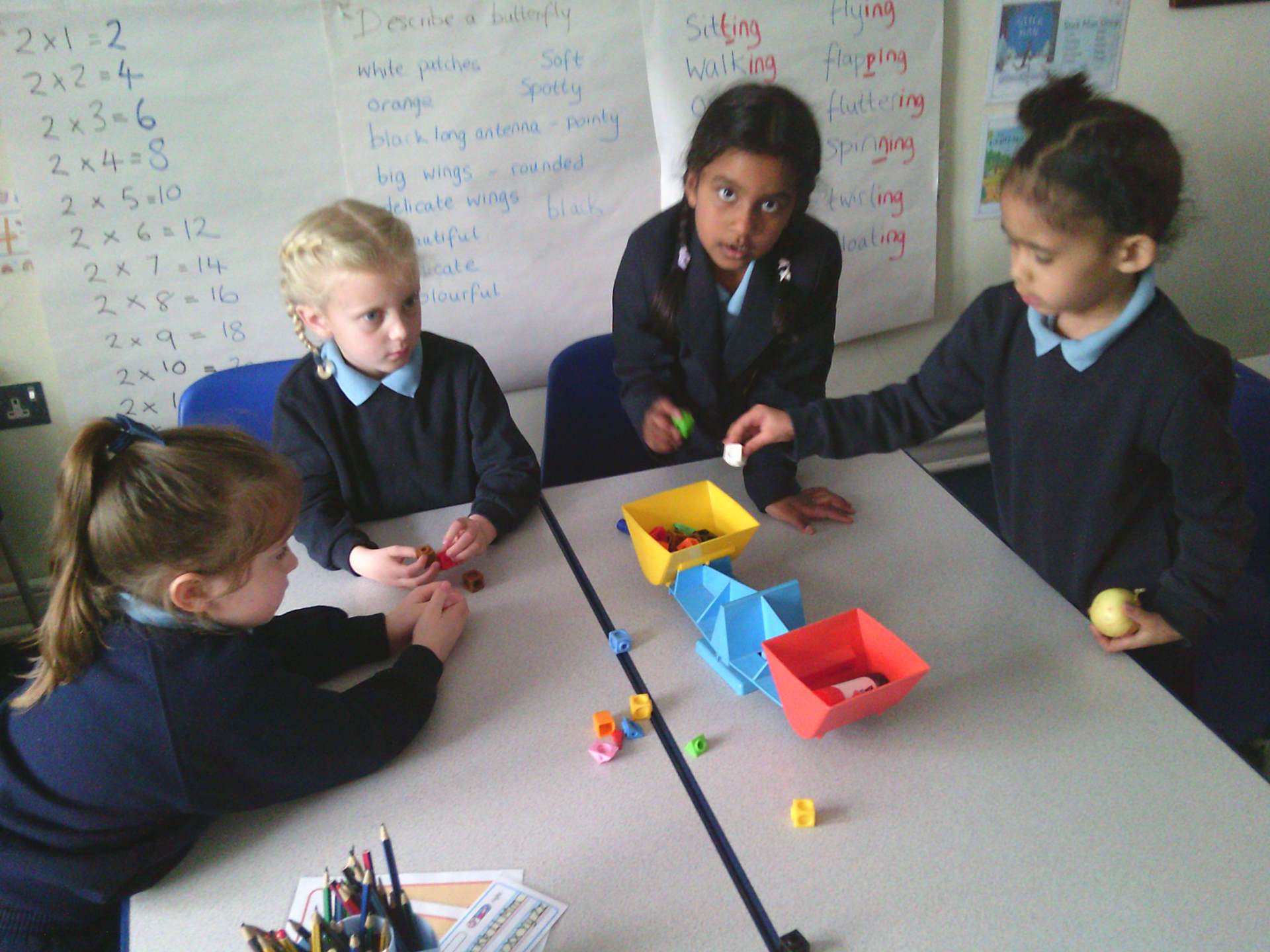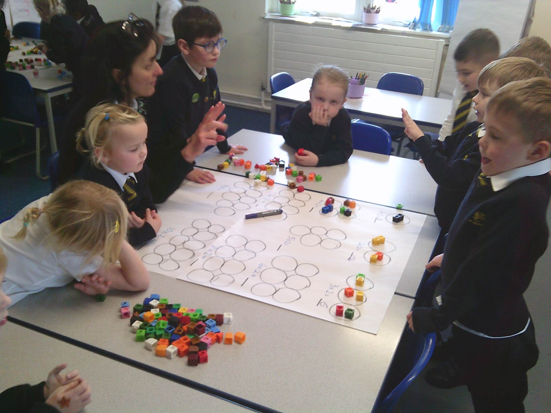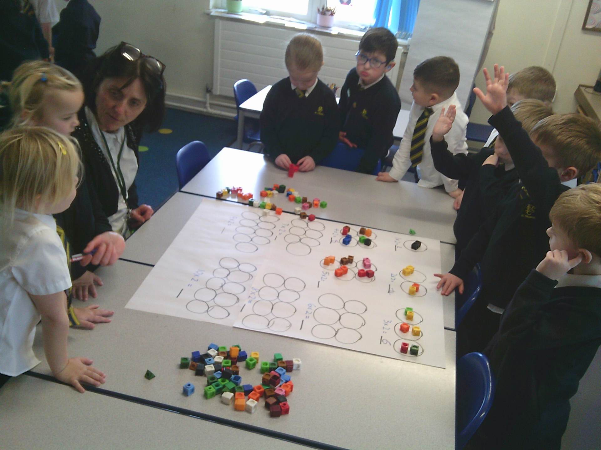 our two times tables. We have used different methods including choral chanting of 1x2 = 2, 2x2 =4 etc… and creating doubling bridging fingers as a mirror image with our partners to help the children visually see how multiplying by 2 is just having 2 of the same number. The children enjoyed a small group practical activity of grouping cubes into twos again to visually represent the multiplication with some children challenging themselves to go past 10x2 to make both 11x2 and 12x2 independently.