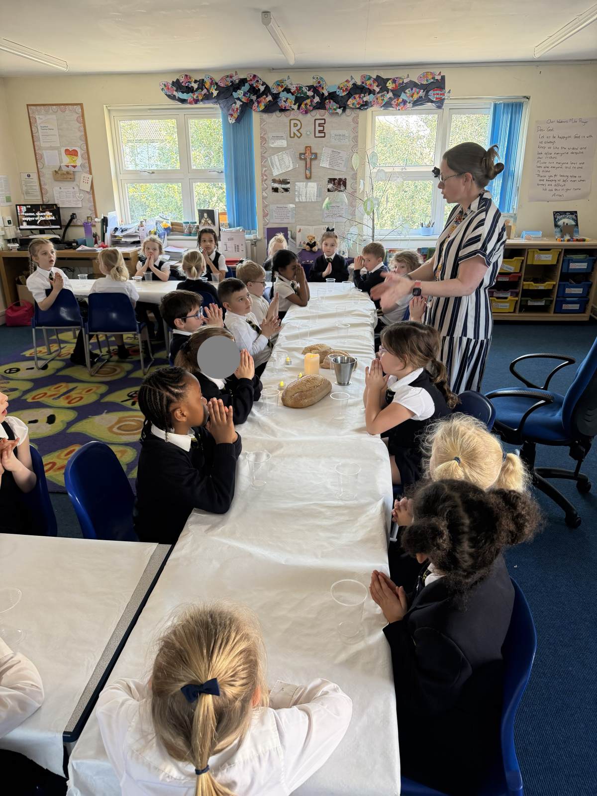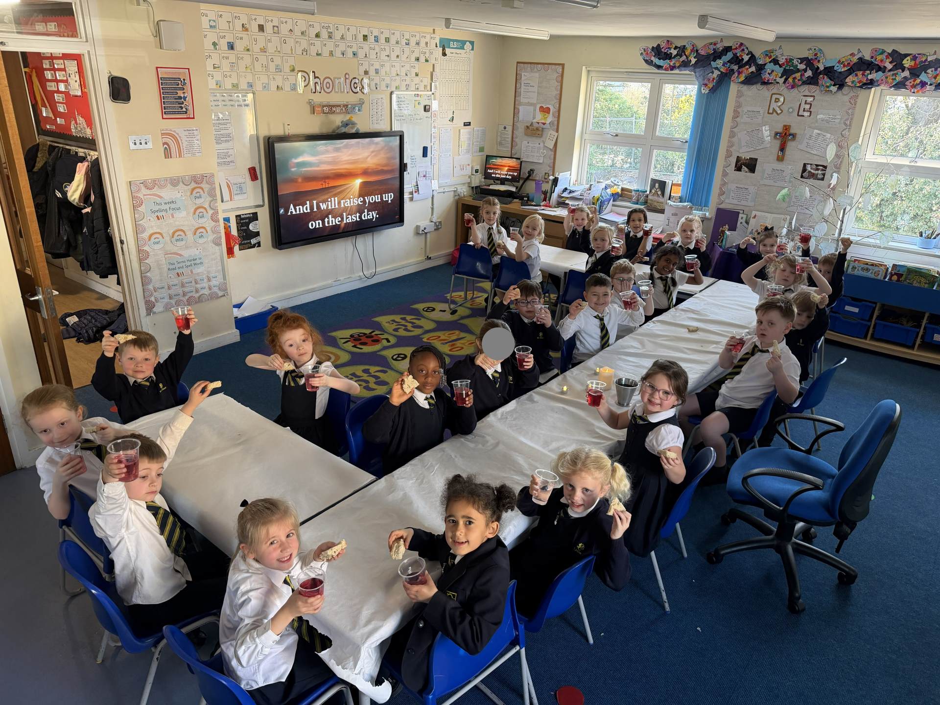 We have explored all about Lent this half term in our R.E lessons starting with Ash Wednesday then moving through to Holy Week including Palm Sunday, the Last Super and the crucifixion of Jesus. To support our input and worksheets the children have re-enacted Jesus riding into Jerusalem on a donkey where they laid down their robes (coats) and palm leaves as he entered. The children were given a “wow”moment when the Year 1 classroom was transformed into the Last Supper. We all became disciples of Jesus and shared both bread and blackcurrant squash to represent the body and blood of Jesus as to recreate this pivotal moment in the lead up to Easter.